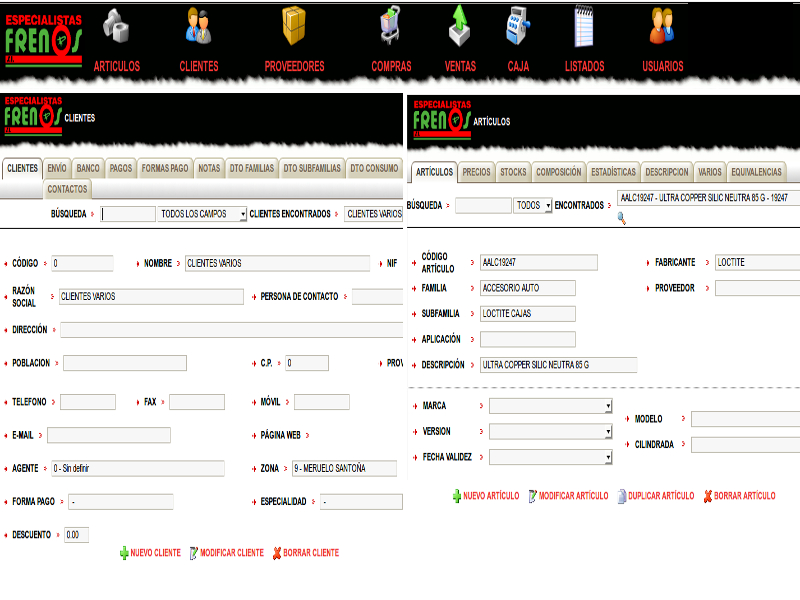 Completo ERP para la gestión de un almacén de recambios multimarca. Realizado en PHP y MySQL.